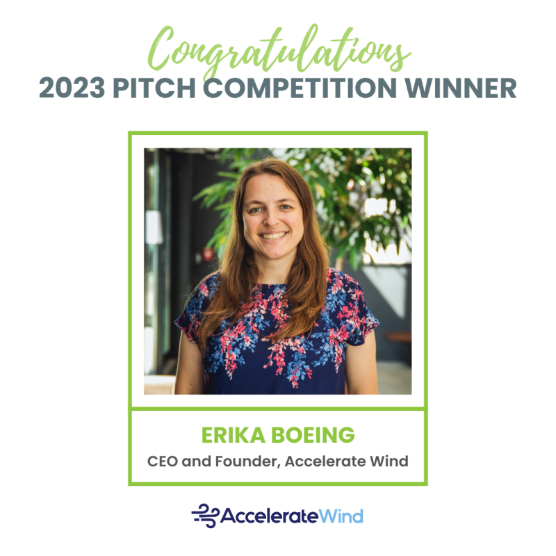 Accelerate Wind won the Women in Cleantech and Sustainability Pitch Competition in June 2023, an annual pitch competition focused on women-led cleantech and sustainability startups from around the world. Erika Boeing, the founder and CEO of Accelerate Wind, pitched with 9 other entrepreneurs on the WCS virtual stage in-front of VCs and an audience of 300+ industry professionals.